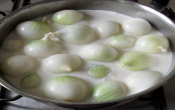 Mettere il latte in un recipiente e aggiungere i pezzi di cipolla. Portare il composto a ebollizione, quindi ridurre il fuoco e lasciar sobbollire a fuoco lento per 10-15 minuti, fino a quando la cipolla diventa morbida.