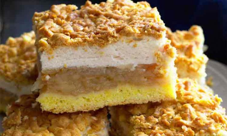 Distribuite le mele sopra il composto con i tuorli, livellate. Poi aggiungete sopra le mele l’impasto con gli albumi. Infine, grattugiate il resto dell’impasto di tuorli sopra.