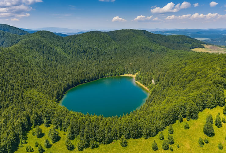 Paesaggi spettacolari: Circondato da una fitta foresta di abeti e latifoglie, il lago ha una forma quasi perfettamente rotonda e un’atmosfera di profondo relax. Il riflesso del cielo e degli alberi nella superficie dell’acqua crea un quadro quasi irreale.