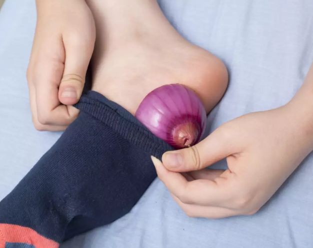 Si può posizionare una fetta di cipolla sulla pianta del piede e poi indossare calze per mantenere la cipolla a contatto con la pelle durante la notte. La pianta del piede ha migliaia di terminazioni nervose e punti riflessi che corrispondono agli organi interni. L’applicazione di una fetta di cipolla attiva questi punti e consente l’assorbimento delle sostanze attive della cipolla attraverso la pelle.