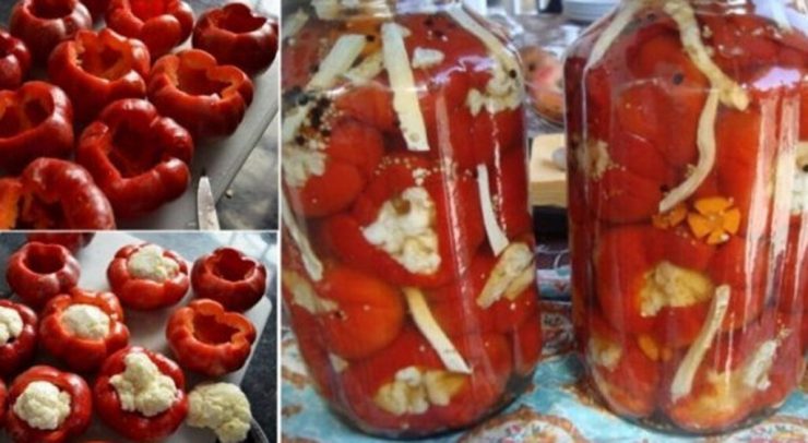 3. Riempiamo i peperoni con il cavolfiore, poi li distribuiamo nei barattoli. Per un barattolo da 800 g aggiungiamo un cucchiaio di sale, 2 cucchiai di zucchero, 100 ml di aceto, spezie per sottaceti e acqua.