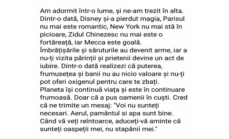 Il pianeta continua a vivere ed è ancora bello. Solo che ha messo le persone in gabbie. Credo che ci stia inviando un messaggio: ”Voi non siete necessari. L’aria, la terra, l’acqua e il cielo stanno bene. Quando tornerete, ricordate che siete miei ospiti, non i miei padroni.”