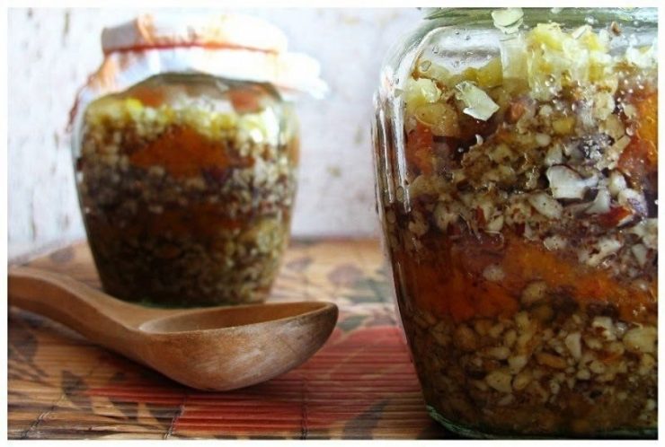Iniziamo a preparare il composto. Passiamo attraverso il tritacarne tutta la frutta secca insieme ai limoni. Per la frutta con noccioli, è necessario rimuovere i noccioli prima. Poi mettiamo la frutta tritata in un barattolo di vetro con coperchio e mescoliamo con il miele. Si conserva in un luogo fresco e si consuma un cucchiaio al giorno, preferibilmente al mattino a stomaco vuoto.